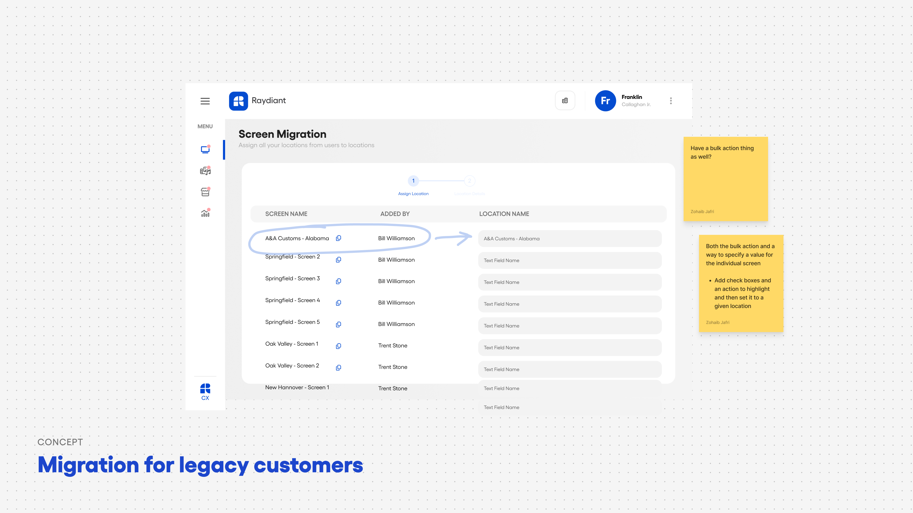 When migration for legacy users came up, I proposed a flow to create Locations and move screens. Leadership opted against investing in a one-off feature, so we explored alternative solutions.